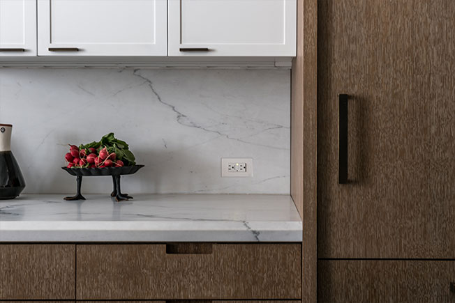 Кухня выполнена по эскизам MKCA, сочетает брашированный дуб и мрамор калакатта.