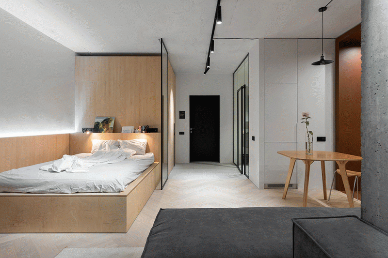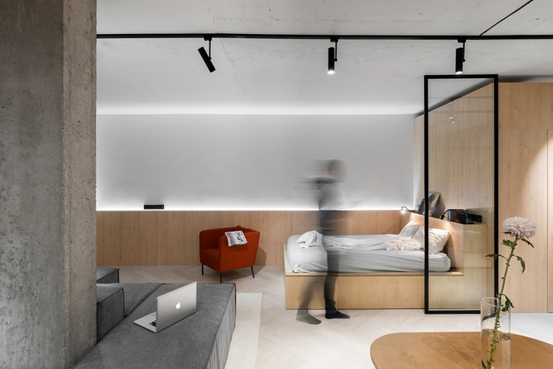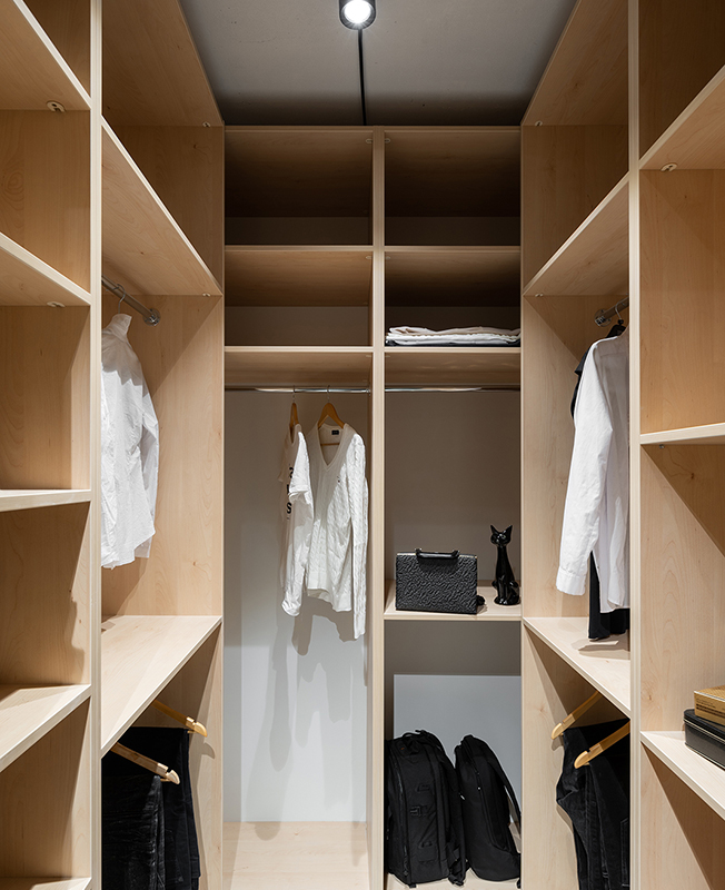 Еще один прием, нацеленный на то, чтобы зрительно прибавить квартирам метров, — стены гардеробной комнаты, которые немного не доходят до потолка и создают иллюзию большего простора.