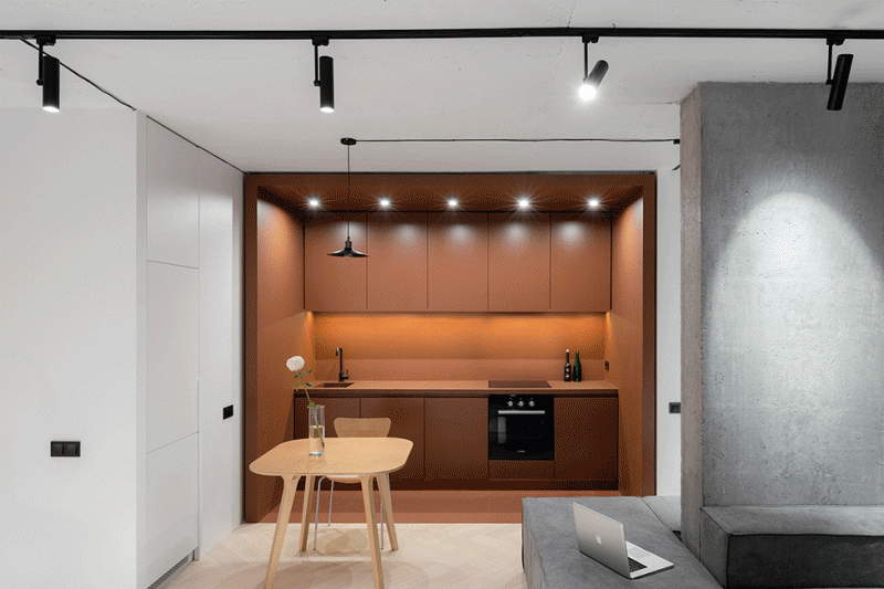 Индивидуальности квартирам решили добавить за счет кухни: в одном пространство она полностью терракотовая, во втором — черная. Терракотовый цвет подерживает обивка кресла в зоне гостиной, черный — оттенок светильников и металлических профилей стеклянных конструкций.