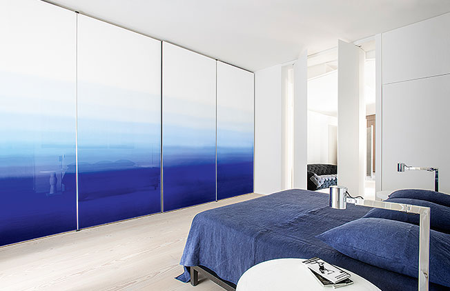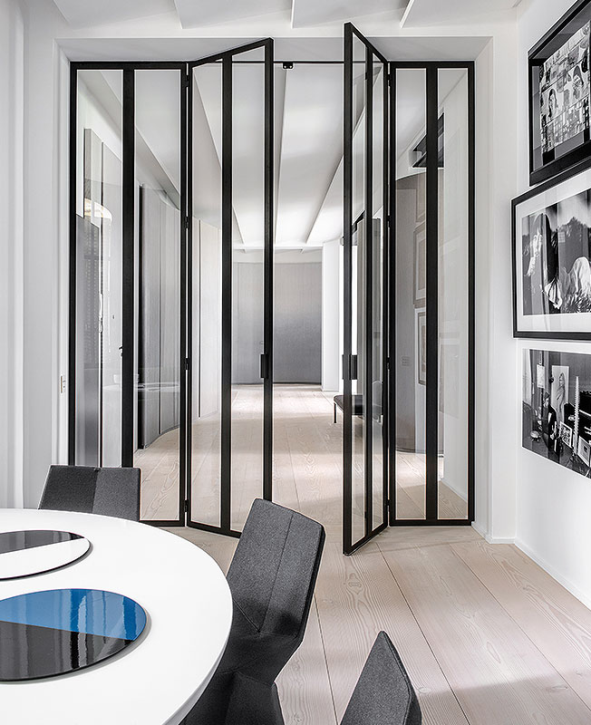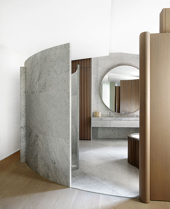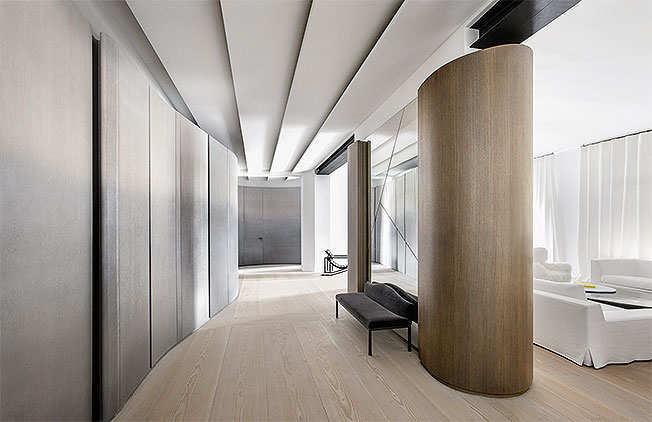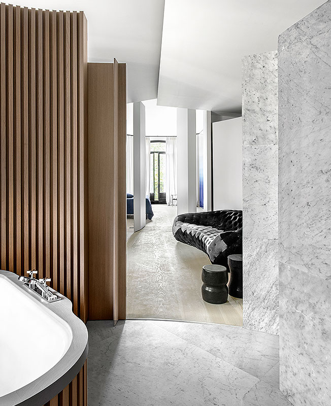 Чтобы избавить интерьер от буржуазного духа, фальшпотолки, появившиеся в 1970-х, были удалены, паркет заменен 6-метровой сосновой доской, установлены 3-метровые раздвижные и поворотные двери. Скругленные поверхности подчеркивают текучесть, чувственность и органичность интерьера. Например, душевая кабина расположена между двумя дугообразными перегородками из мрамора. По вечерам комнаты подсвечены встроенными в пол лампами: лучи отраженного света касаются поверхностей, подобно свечам.
