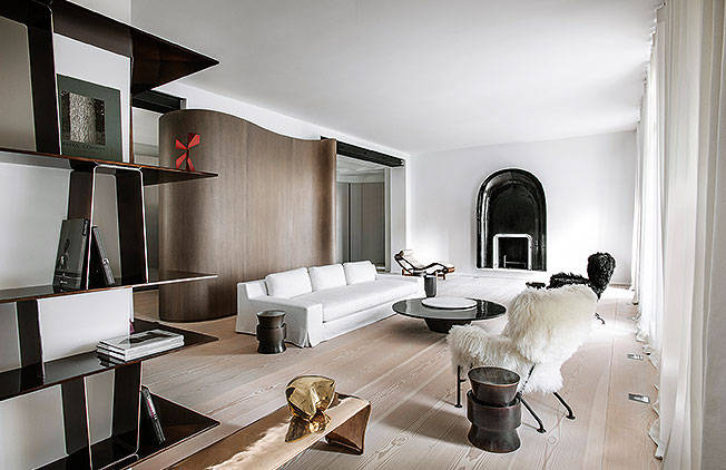 «Я хотел вытащить эту декорацию из прошлого и превратить ее в нечто мощное — модное и тем не менее вневременное. Для этого пришлось до основания оголить пространство, сфокусировавшись на деталях, которые больше имеют отношение скорее к архитектуре, чем к интерьерному дизайну». Так возник этот красивый, убедительный интерьер, лаконичный, но не стерильный и, несмотря на почти полное отсутствие цвета, — очень яркий.