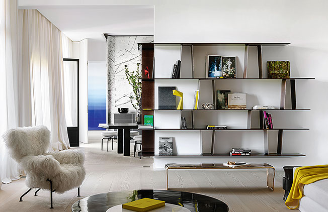 «Я не подвержен прихотям моды», — сообщил нам Франсуа Шампсор. И хотя для этой квартиры автор присмотрел «иконы дизайна», надо отдать должное его нетривиальному выбору. Кресло Transat (сокращенно от Transatlantic) — редкая модель в сегодняшних проектах — создано Эйлин Грей в 1927 году для собственного дома. Оно напоминает шезлонги, устанавливаемые на палубах межатлантических лайнеров (отсюда и название), архитектор Эккарт Мутезиус использовал его для меблировки дворца махараджи в Индоре (1929-1930). Культовую модель Франко Альбини, кресло Tre Pezzi (1959), Шампсор выбрал в ироничной версии — в обивке из шкуры монгольской козы.