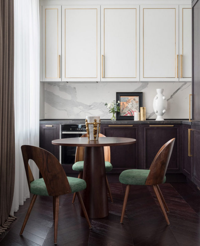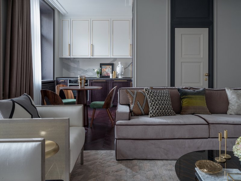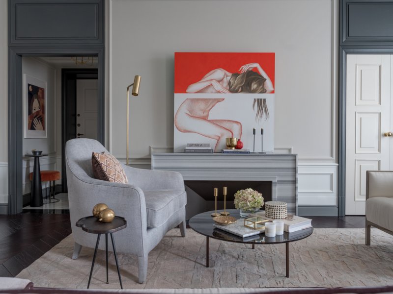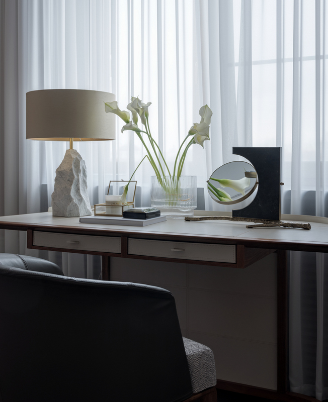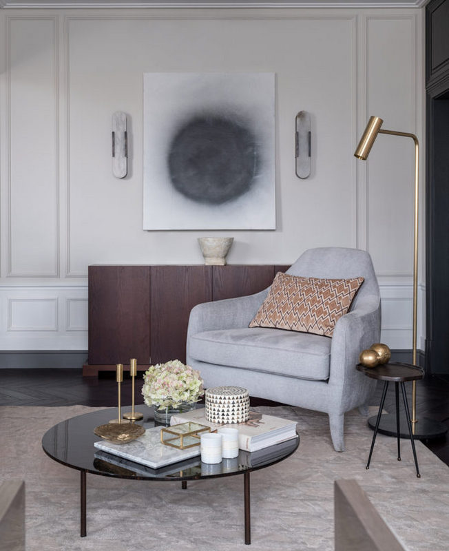 «Основным стимулом было уйти от «русской» вычурности в интерьере. Возможно, в какой-то степени на подсознательном уровне свою лепту внесла эстетика Триумфальных ворот на Кутузовском, расположенных рядом с домом. По сути интерьер создан по моим внутренним впечатлениям от заказчицы — ее манере говорить, одеваться, ее рассказах о любимых местах, хобби», — делится впечатлениями Сергей.