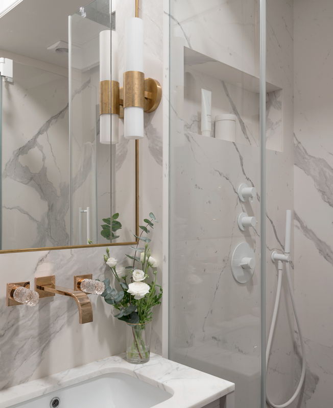 «Заказчица была категорически против обоев в любом виде, только покраска. В санузле и прихожей – натуральный мрамор, в гостиной и спальне — паркетная доска французской елкой. На стенах в ванной — керамика АRCH-SKIN. Изначально хозяйка квартиры была решительно настроена в пользу натурального мрамора, но так как сама ванна совсем крошечная, я предложил использовать тонкий керамогранит с рисунком под мрамор, чтобы не «сьедать» пространство толщиной камня».