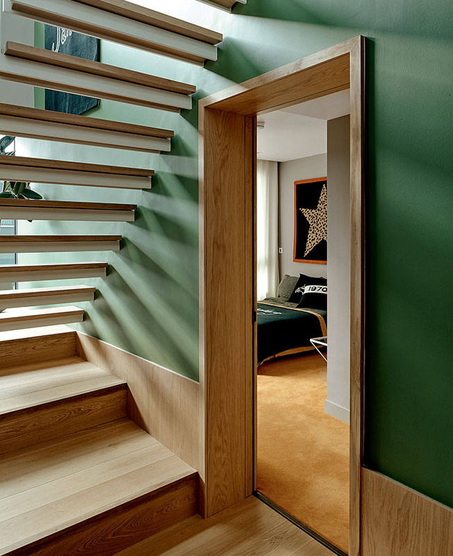 В апартаментах два этажа, на первом — три спальни, на втором — кухня-столовая и гостиная, из которой можно попасть на крышу. Окна выходят на запад и восток. Сочные цвета создают динамичную основу. Несмотря на яркость, оттенки приятны глазу, поскольку взяты из природы. Самый заметный, зеленый в гостиной, носит название травянистого зонтичного растения дудник — angeliсa green.