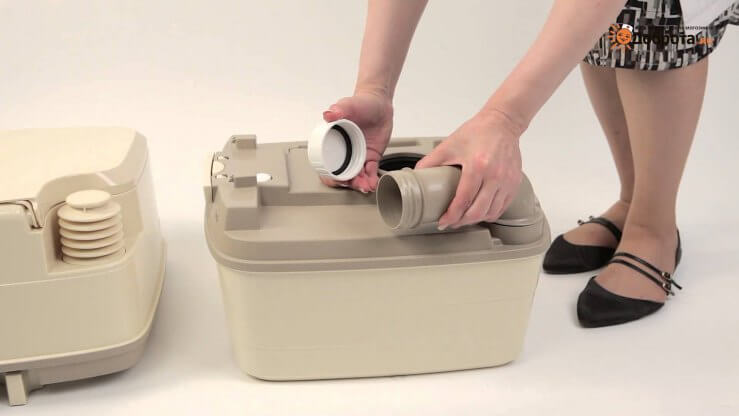 Помимо двух бачков в конструкции присутствует сливной патрубок для опорожнения нижнего бака от жидких отходов. Обе емкости соединяются между собой при помощи защелки, она используется при отсоединении нижнего бака для удаления твердых отходов.