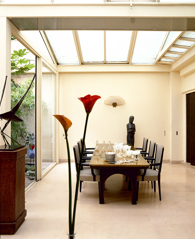 Внутреннее пространство разделили по высоте на две части. Наверху устроена приватная зона, нижняя часть предназначена для приема деловых партнеров и встреч с друзьями. Теперь это самое ослепительное место в доме. Свет проникает через потолок и стеклянную стену, за которой открывается живописный внутренний садик. Вдоль прозрачной стены тянется открытая анфилада гостиных.