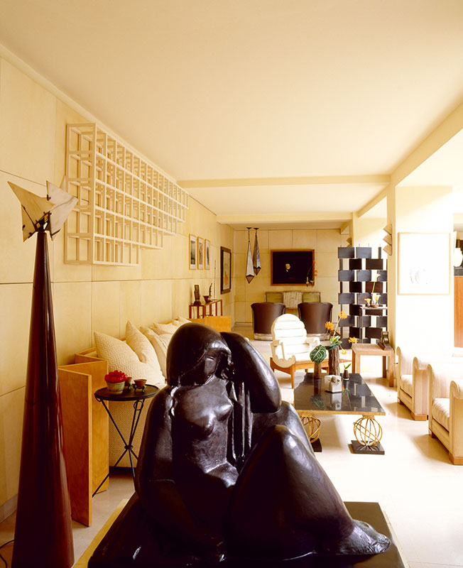 Здесь расположился стеклянный, с перламутровой вставкой, уникальный комод Рульмана, одного из основоположников ар деко. (Когда-то он принадлежал Карлу Лагерфельду.) Знаменитая ширма с подвижными створками, визитная карточка Эйлин Грей, отгораживает главную гостиную. На небольшой площади собран великолепный ансамбль, где ведущие партии исполняют диван Франка, кресло Гру и светильники Шаро с плафонами из алебастровых пластин...