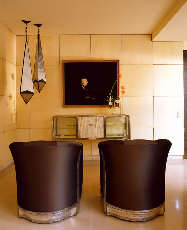 Несущие колонны разделяют их на своеобразные экспозиционные залы, где расставлены шедевры ар деко. Лучше всего собрание первого этажа видно из столовой, расположенной перпендикулярно анфиладе. Гостям есть чему подивиться. Оставив пальто в прихожей на кресле Жана Дюнана, они попадают в первый «зал».