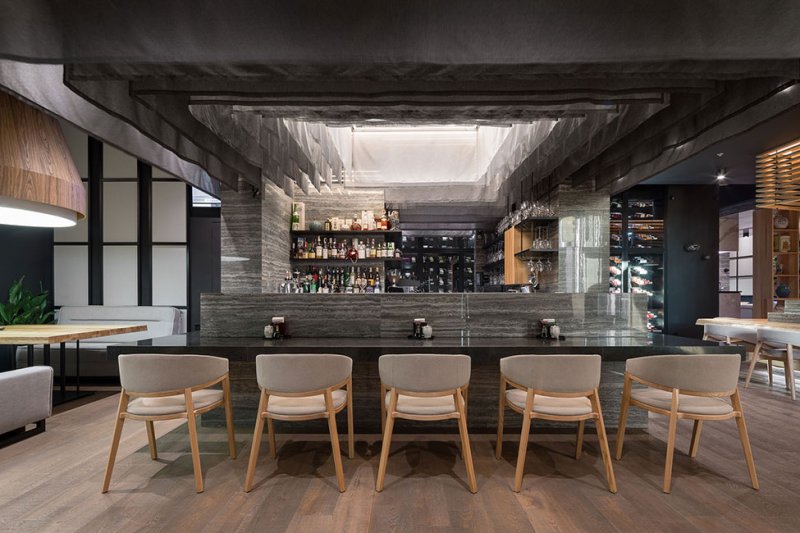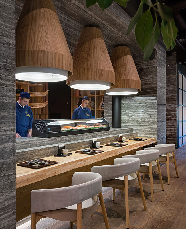 Если вернуться к бонсаям и повернуть налево, то гость окажется в зоне темпуры, робата-гриля. Здесь же расположены многочисленные места посадки и еще одна комната-татами. Кульминационной зоной ресторана стал травертиновый бар, расположенный под легкой серой тканью.