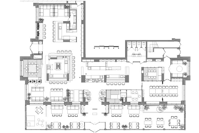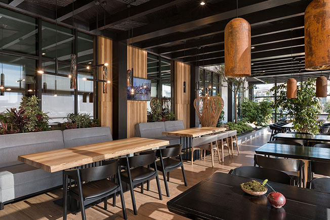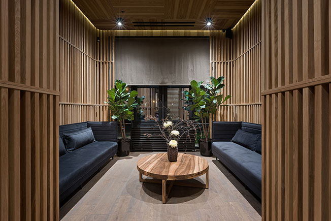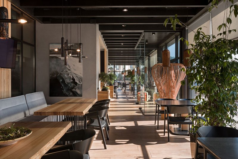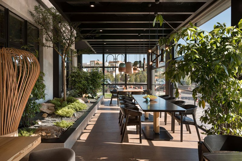 При входе посетителей встречает терраса-сад. Панорамные окна обеспечивают большое количество естественного света. Выкрашенный в черный цвет деревянный потолок дополнен объемными светильниками в форме часенов — венчиков для взбивания чая матча — с мягким рассеянным освещением.