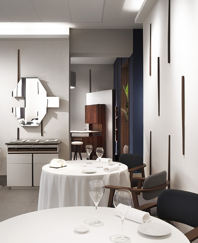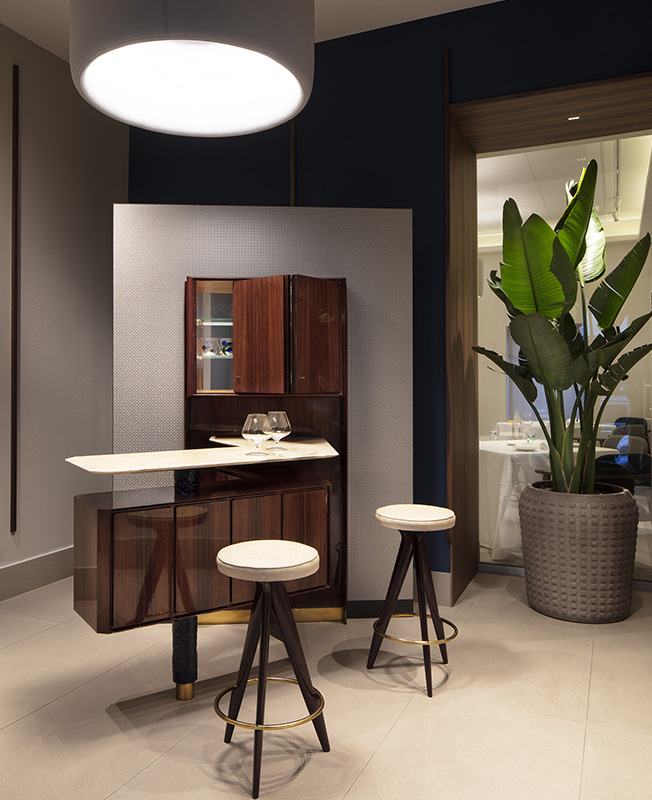 Теплые тона грецкого ореха каналетто соответствуют оттенкам миланского района, где расположен ресторан. Вход с оригинальным баром 1950-х годов, спроектированным известным миланским архитектором Освальдо Борсани напоминает об архитектурном прошлом Милана.