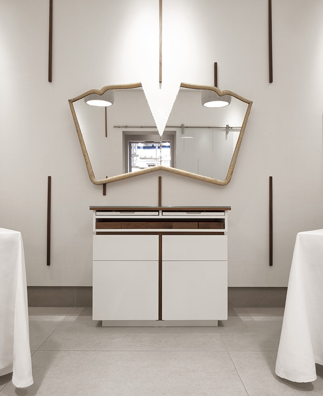 Обои с эффектом льна окутывают пространство, в то время как зеркала неправильной формы (уникаты Джанпьеро Романо) придают комнатам легкую иронию и легкость.