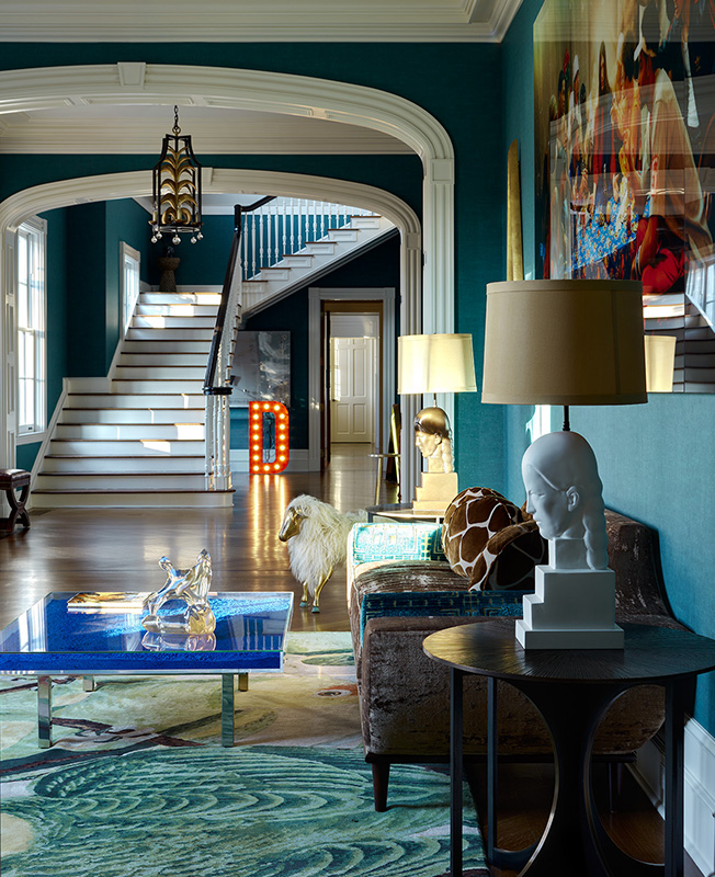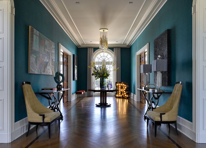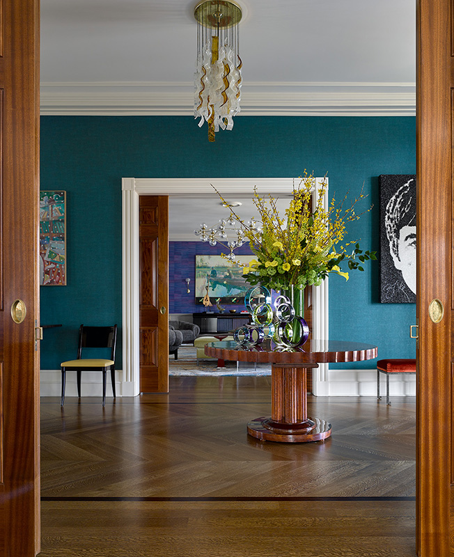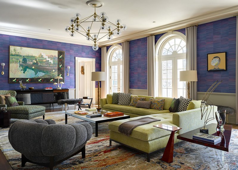 Музыкальный салон. Диван Владимира Кагана. Голубые кресла, диз. Жан-Луи Деньо для Collection PIerre, желтые кресла Brabbu. Люстры Veronese. Стулья Liaigre. Обои Casamance, ковер Bokara. Столики Holly Hunt и Dering Hall. Зеркала Meridien. Парные комоды 1950-х, диз. Пьер Луиджи Колли. Торшеры Lorin Marsh. Стулья Liaigre. На стене винтажное панно работы Фредерика Вайнберга.