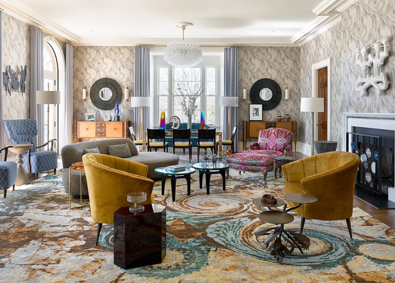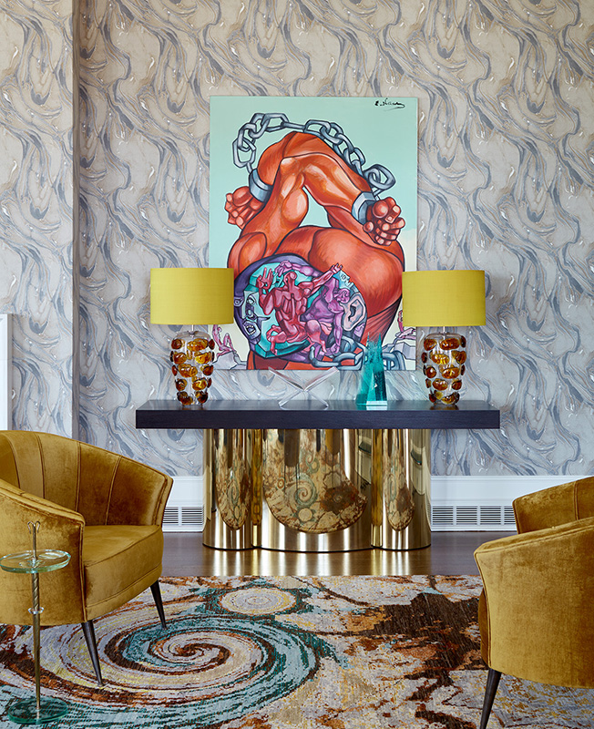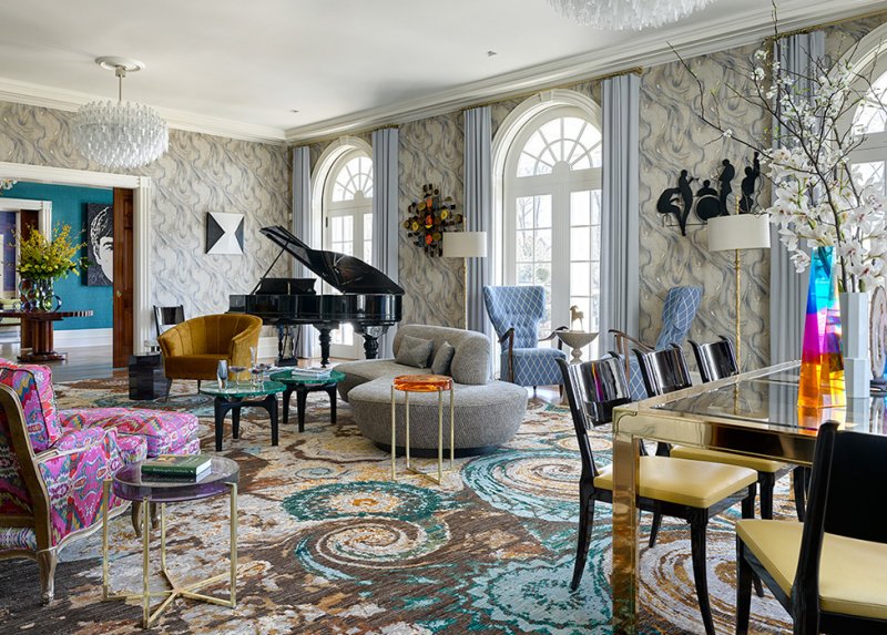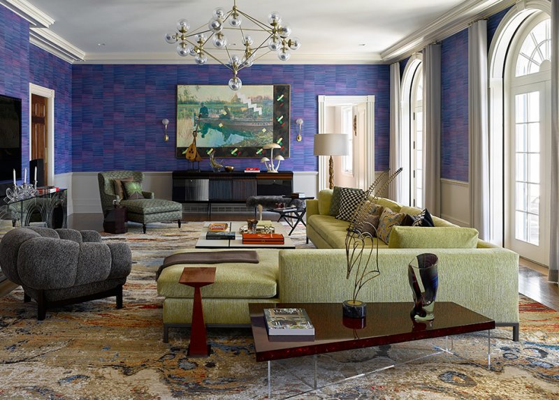 Дизайнеры создали необычно яркий и плотный по декору, смелый, визуально богатый интерьер: цветные стены, многоцветные ковры, мебель разных стилей, провокационное искусство. Стандартным его точно не назовешь. Главное, что хозяевам здесь хорошо — окружение отвечает их энергетике и темпераменту.