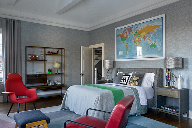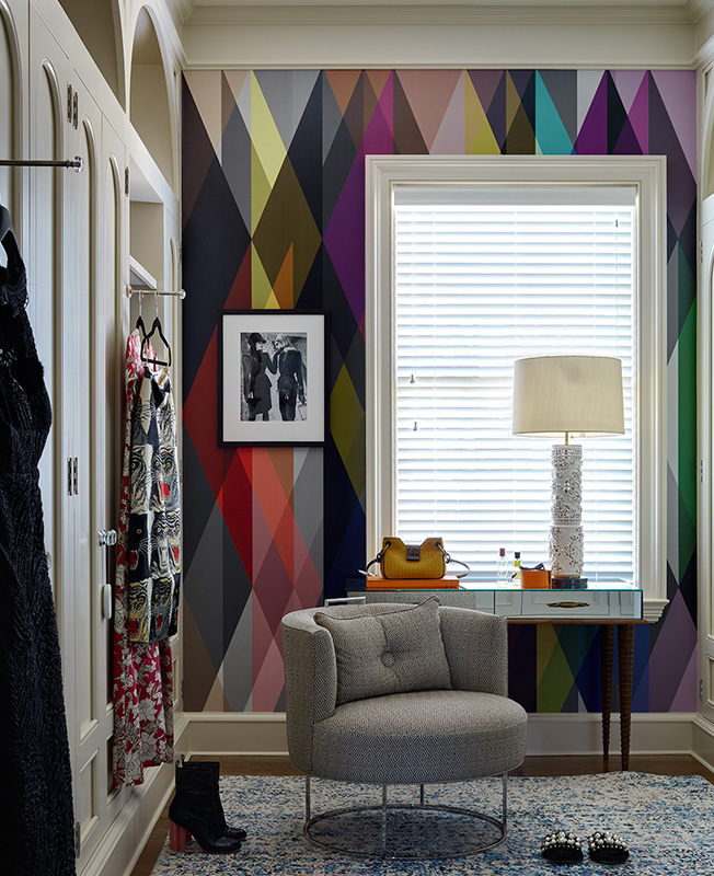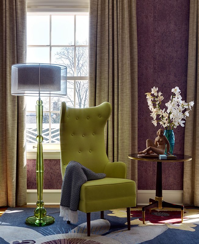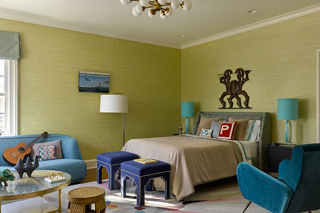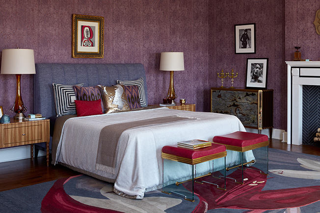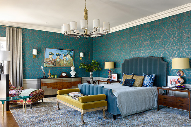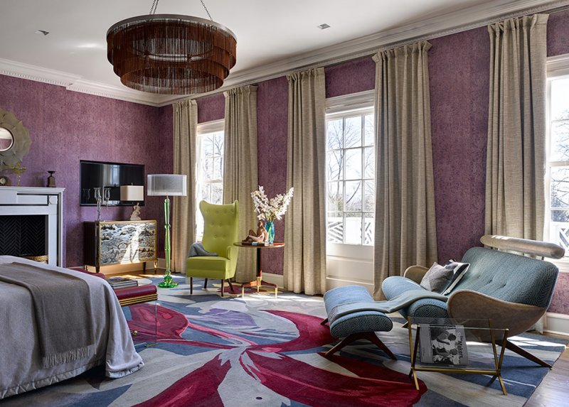 Спальня хозяйкитересный прием дизайнеров — сочетание обоев насыщенного цвета с нейтральным текстилем для штор. Кровать The Sofa & Chair. Табуреты из кожи и акрила 1940-х. Люстра Tigermoth. Ковер, диз. Юрген Далманнс. Кресло Downtown20. Торшер Lorin Marsh.
