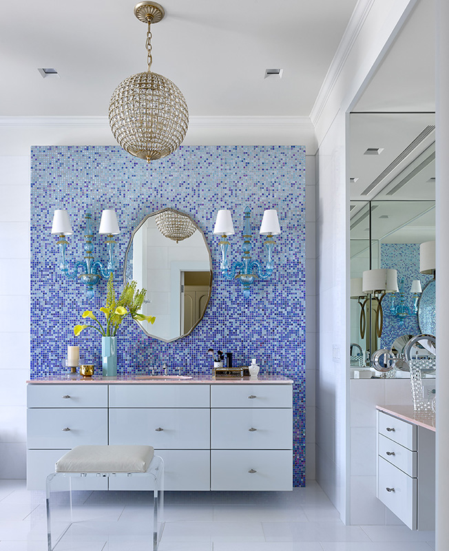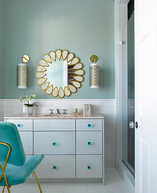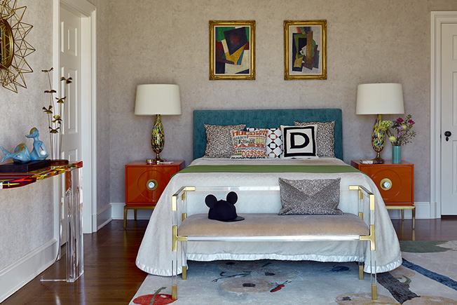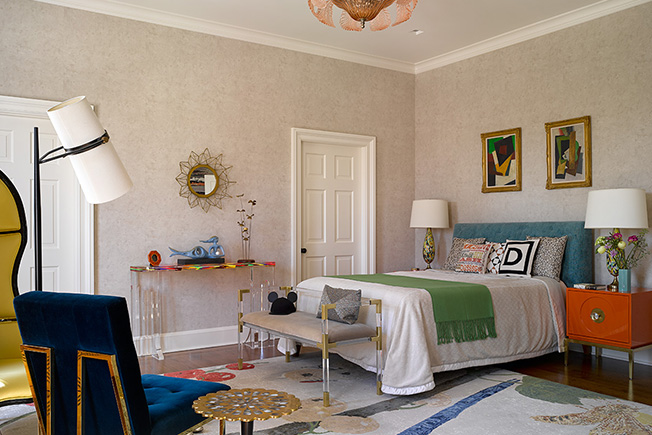 Фрагмент одной из спален. Люстра: винтаж. Комод, столик, этажерка Jonatan Adler. Кресло Brabbu.