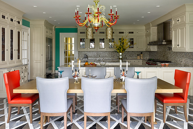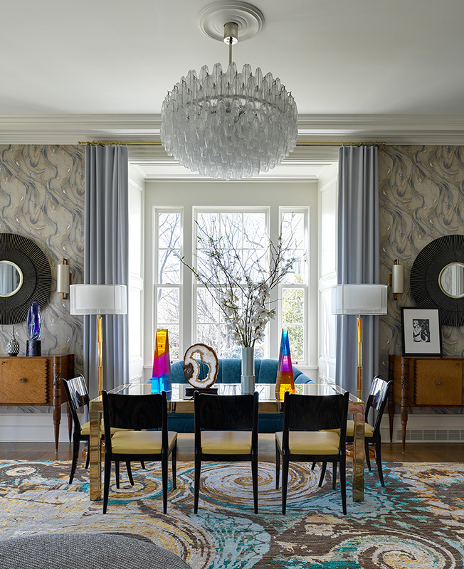 Музыкальный салон переходит в столовую. Люстры Veronese. Зеркала Meridien. Парные комоды 1950-х, диз. Пьер Луидж Колли. Торшеры Lorin Marsh. Стулья Liaigre. Ковер Bokara.