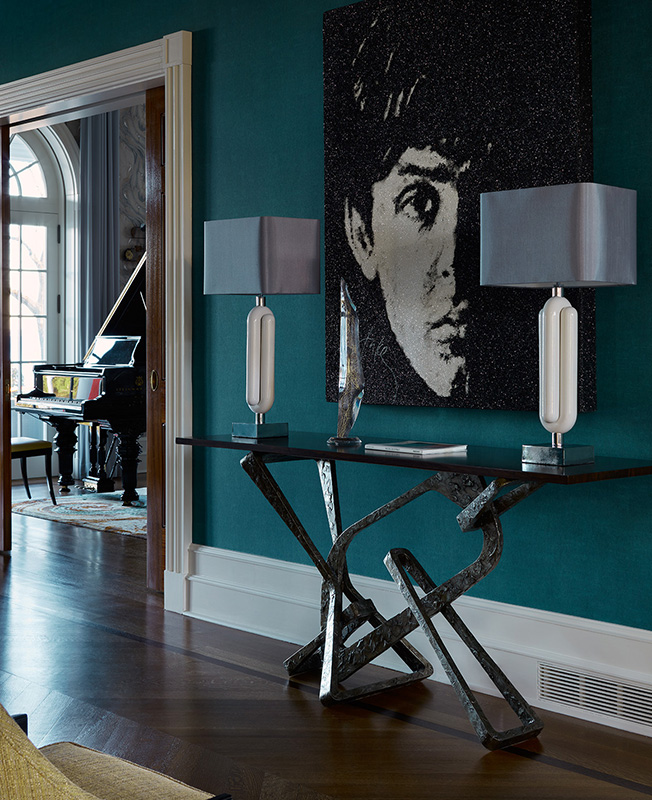 Холл. Портрет Пола Маккартни — работа Блейка Балларда. На стенах обои Casamance — Ананьевы предпочитают однотонные обои покраске, поскольку те обогащают поверхность фактурой. На консоли Century лампы Aldo Nason, 1960.