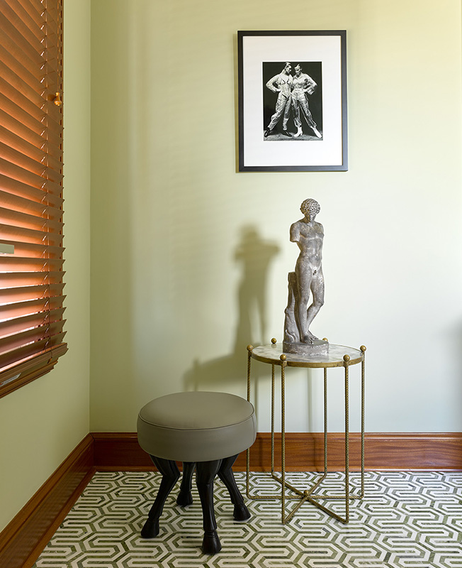 Первый этаж представляет собой замкнутую в круг анфиладу комнат. Антикварный стол мастера ар-деко Жюля Леле авторы проекта сместили относительно оси. Таким образом они нарушили симметрию, которая придавала бы интерьеру излишнуюю строгость, и отрыли вид на анфиладу.
