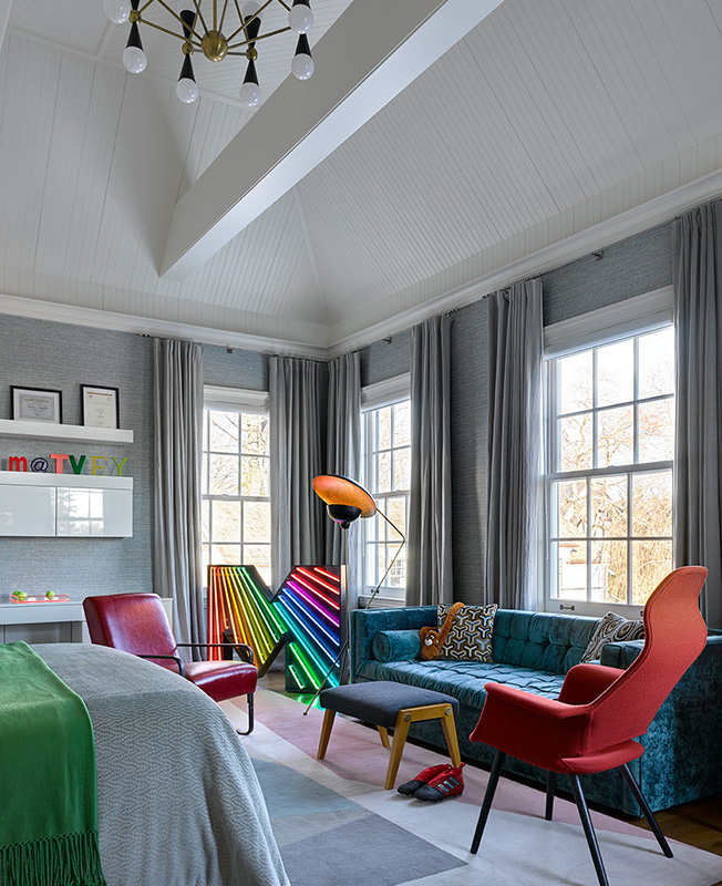 Малая гостиная на первом этаже получила название «арт-рум». Справа на стене работа Дэвида Лашапеля. Столик Holly Hunt. Ковер, диз. Юрген Далманнс. По всему дому расставлены светящиеся буквы — с них начинаются имена членов семьи.