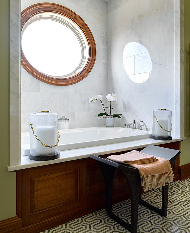 Дизайнеры были щедры на идеи. Цвета — от «петролеума» до «баклажана», своя особая палитра проработана в каждой комнате. Стилистический разброс — от респектабельных люстр муранского стекла до шкафов из плексигласа. Основу образует дизайн 1950–70-х. Предметы на грани китча оберегают интерьер от буржуазности.