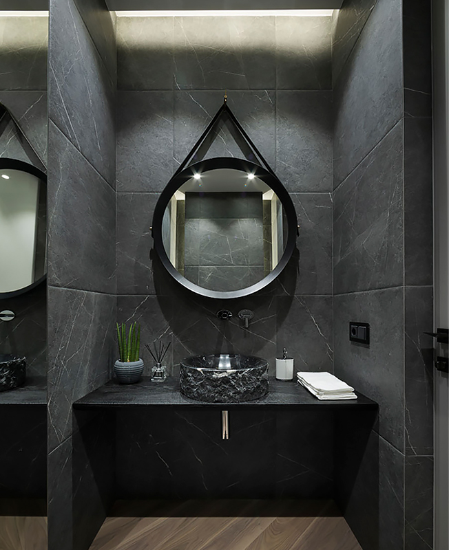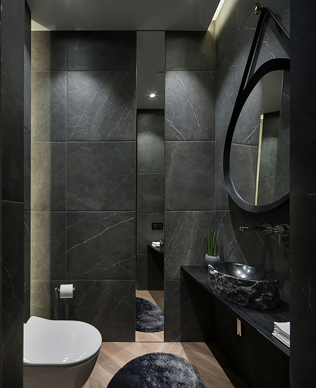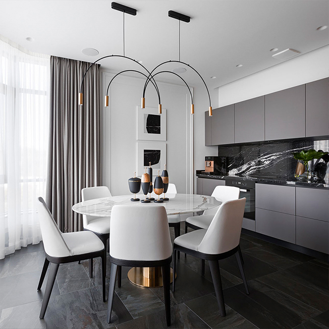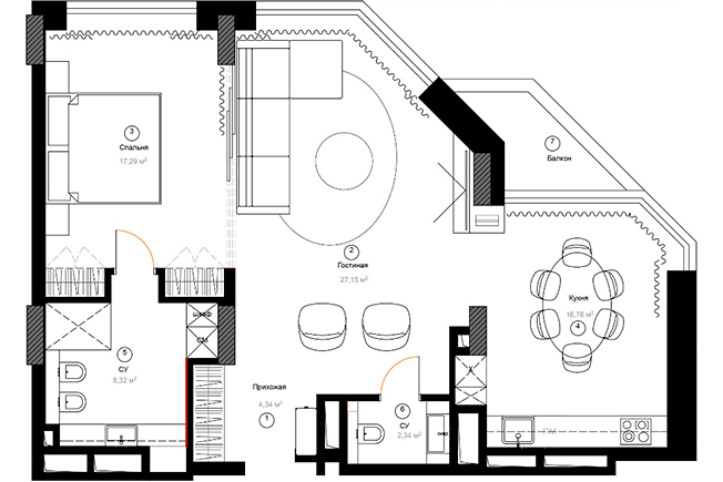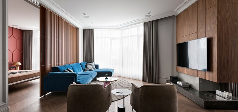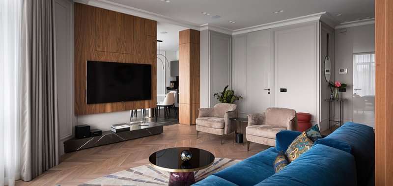 Заказчики, семейная пара, хотели получить свободное, комфортное пространство. На площади 80 кв. метров архитекторы разместили все необходимые зоны — гостиную, спальню, кухню, столовую и два санузла. Двери имеют только хозяйская ванная комната и гостевой санузел. Остальные пространства плавно перетекают друг в друга, создавая ощущение большего простора.