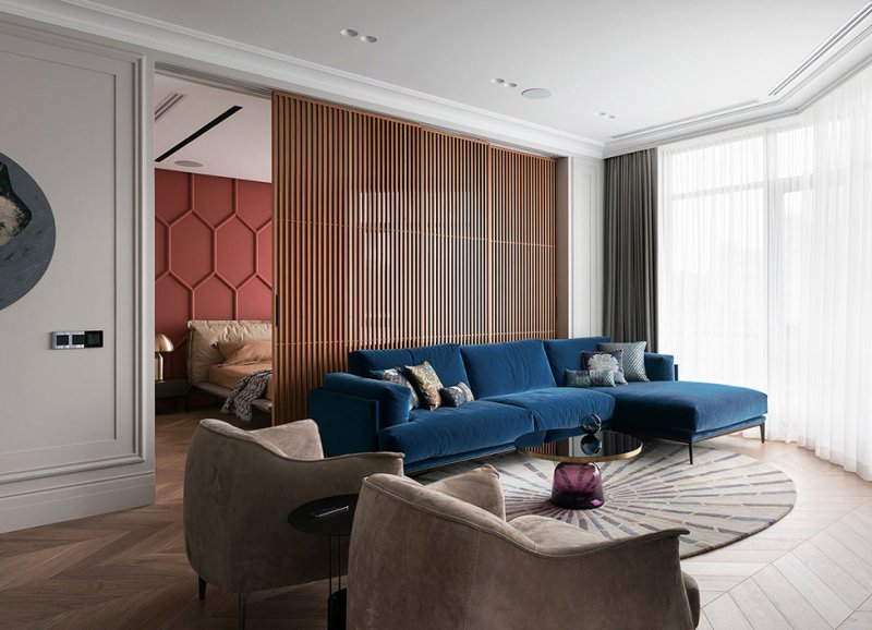 Спальня символически отделена от гостиной сдвижной перегородкой — она пропускает свет, не перекрывает полностью видимость и не превращается в глухую стену, но делает пространство более уютным и инимным.