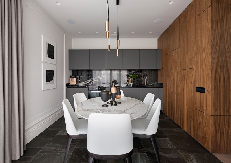 Так, специально для этого интерьера были изготовлены кухонный гарнитур, блок над камином и стеновые панели со скрытыми системами хранения. Материалы выбрали благородные, вне времени — использовали древесину, мрамор, кожу, латунь и стекло.