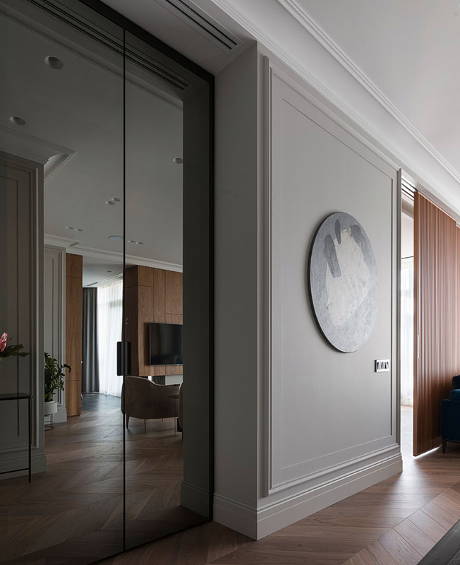 В спальне же расположено и самое яркое цветовое пятно всего интерьера — стену за изголовьем, выкрашенную в насыщенный оттенок, украшает рельефный узор. Он перекликается с классическими гипсовыми молдингами на других стенах — как и нейтральная палитра в остальных зонах квартиры, они отсылают к парижским интерьерам в османовских домах.