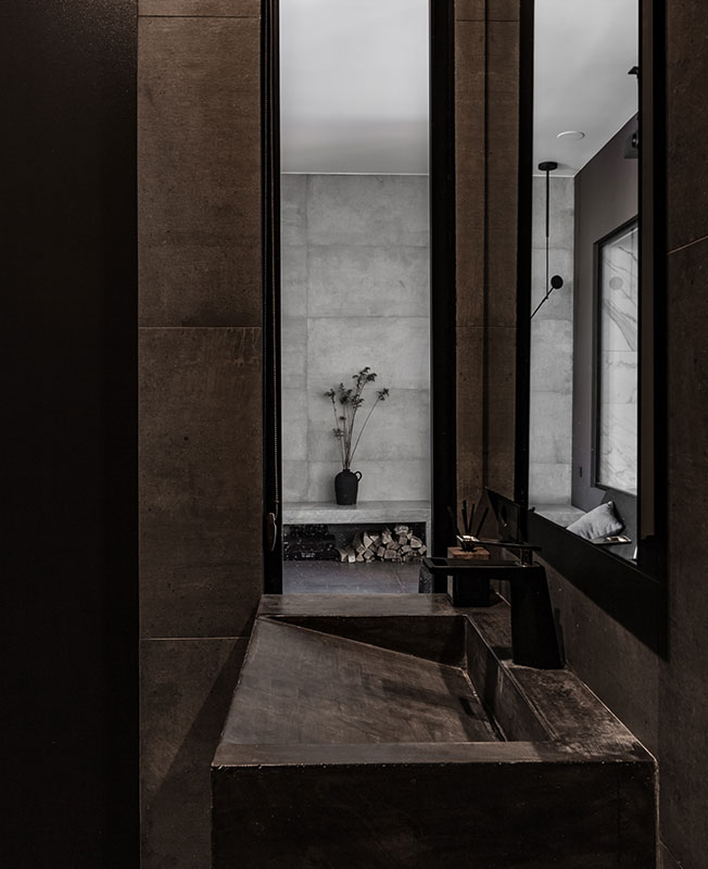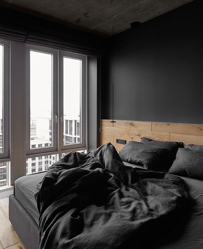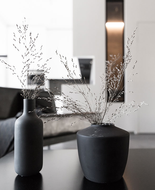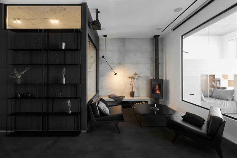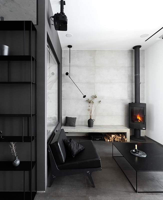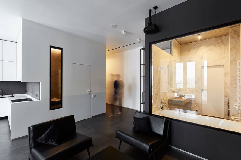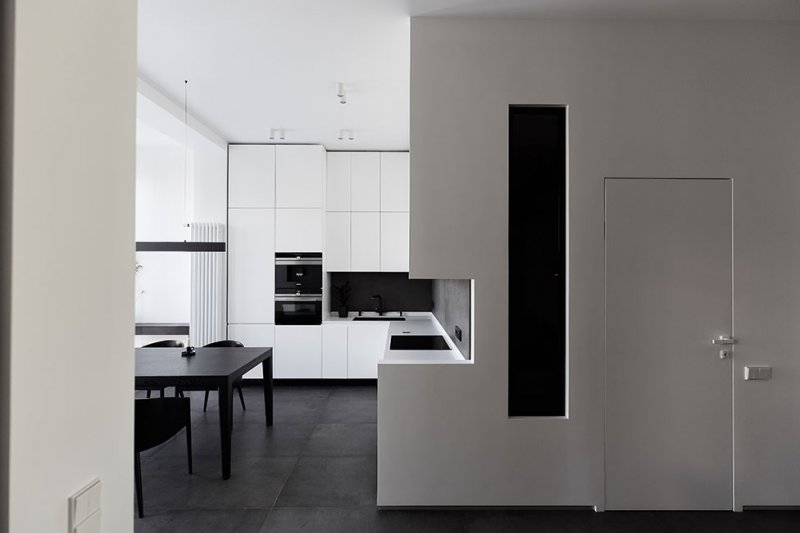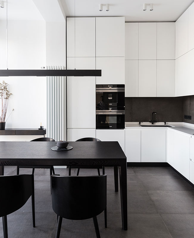 Заказчикам хотелось видеть интерьер контрастным, с большим количеством белого и черного. Темный керамогранит и лаконичные стены — это те материалы и цвета, на которых строится концепция.