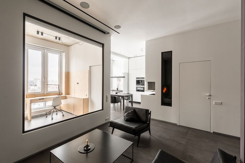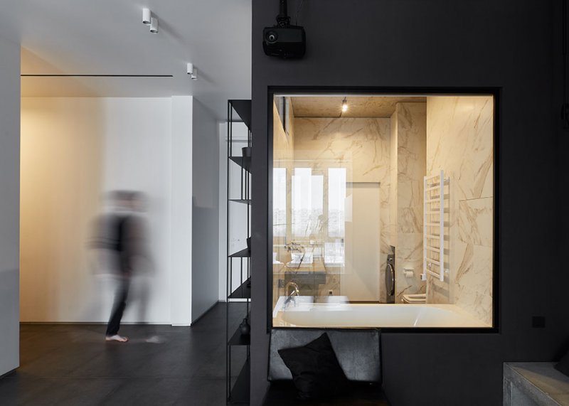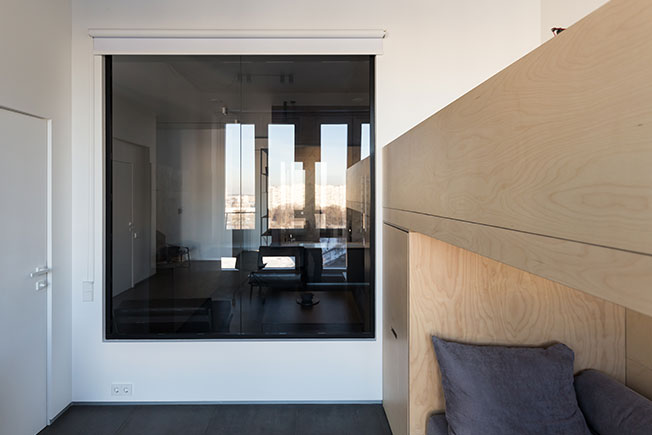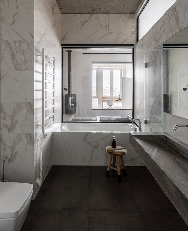 В результате родилось такое решение: в детской комнате сделали большое внутреннее окно. Таким образом свет попадает в гостиную, а также с дивана можно любоваться панорамным видом. Мы повторили этот прием и в организации пространства санузла. Теперь принимая ванну, можно смотреть на огонь в камине (квартира расположена на последнем этаже — застройщиком была предусмотрена возможность установки камина).