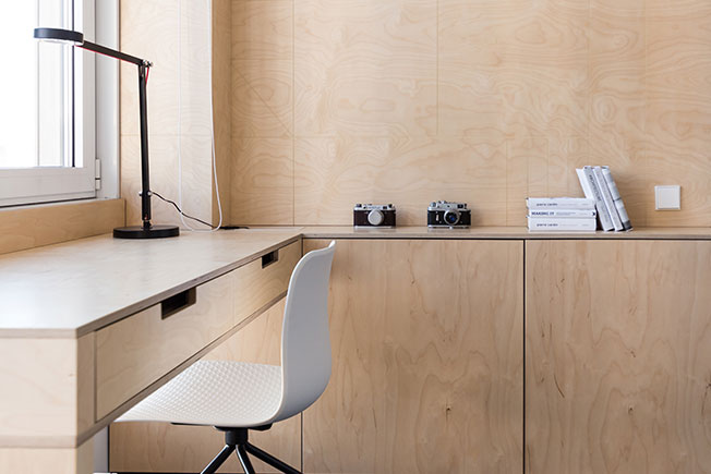 Самый интересный предмет мебели — заказная фанерная конструкция в детской от столярной мастерской «Механические деревянные шестеренки». В том же материале реализован и рабочий стол.