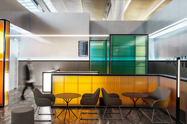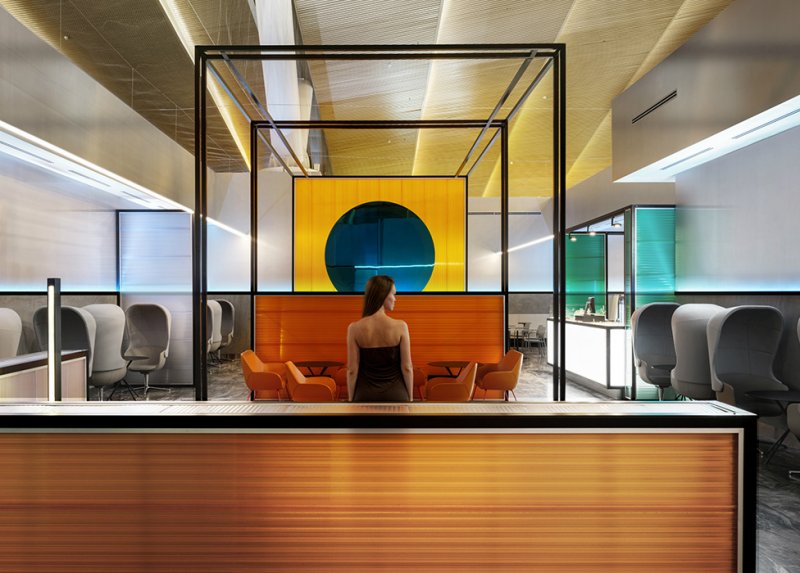 Бюро VOX Architects имеет немалый опыт в проектировании аэропортов: в портфолио — Кольцово в Екатеринбурге, Курумоч в Самаре, терминал B Шереметьево, Платов в Ростове-на-Дону. Разрабатывая интерьер бизнес-зала международного сектора в аэропорту Платов, архитекторы обыграли мотив заката, в зале Priority Pass — продолжили тему солнца.