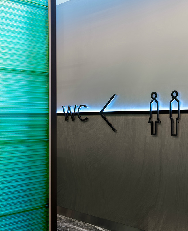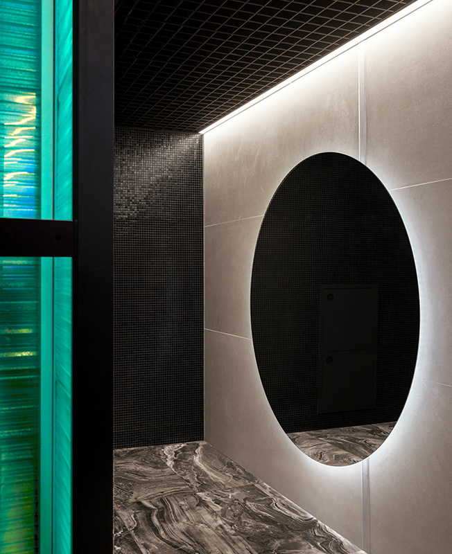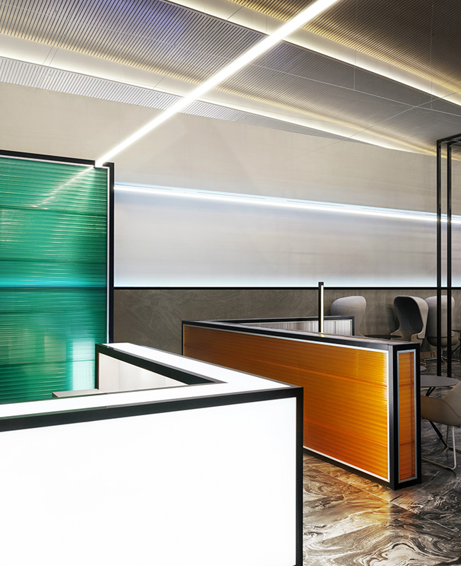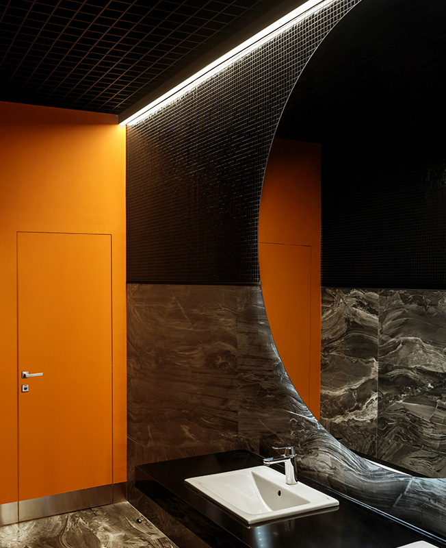 На перегородках по периметру помещения архитекторы расположили металлический профиль. Он находится на уровне глаз стоящего человека и отбивает графическую линию, которая символизирует степной горизонт. По замыслу авторов, это горизонт во время рассвета: из-за профиля брезжит голубое сияние — в профиле спрятан линейный источник, подсвечивающий поверхность снизу вверх. Ниже линии профиля перегородки отделаны керамогранитом.