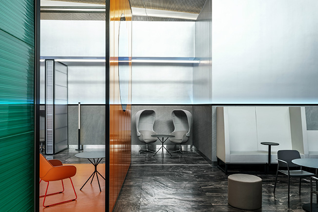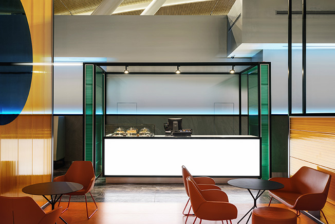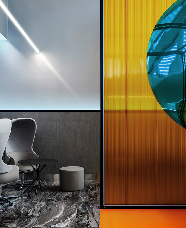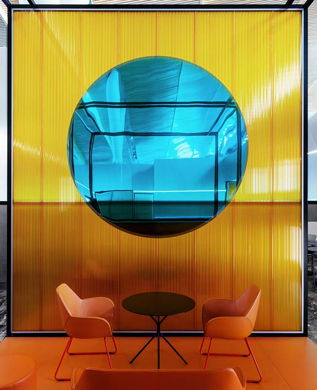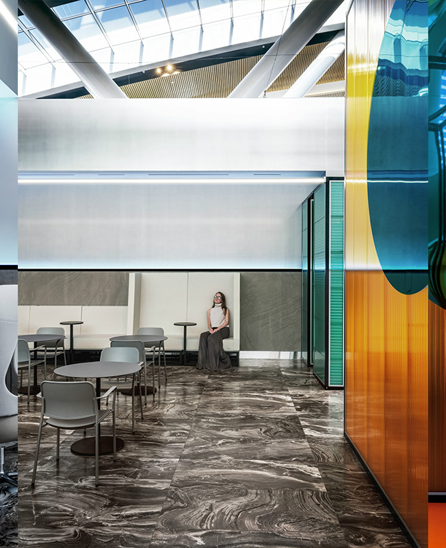 Концепция призвана увести верхнюю часть пространства от материальности, сделать ее эфемерной. Этому способствуют и стеклянная кровля, и прозрачные перегородки, разделяющие зал на функциональные зоны. Перегородки разнообразны по высоте, пропорциям и цвету, но все заключены в тонкие металлические рамы, вторящие графике «горизонта». Прозрачные слои и тонкие линии наслаиваются друг на друга в перспективе. В центре зависает большое зеркальное синее солнце.