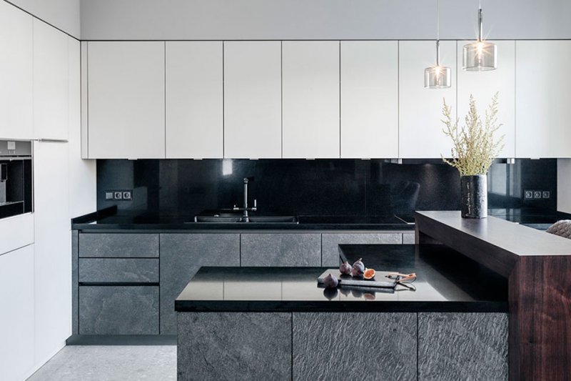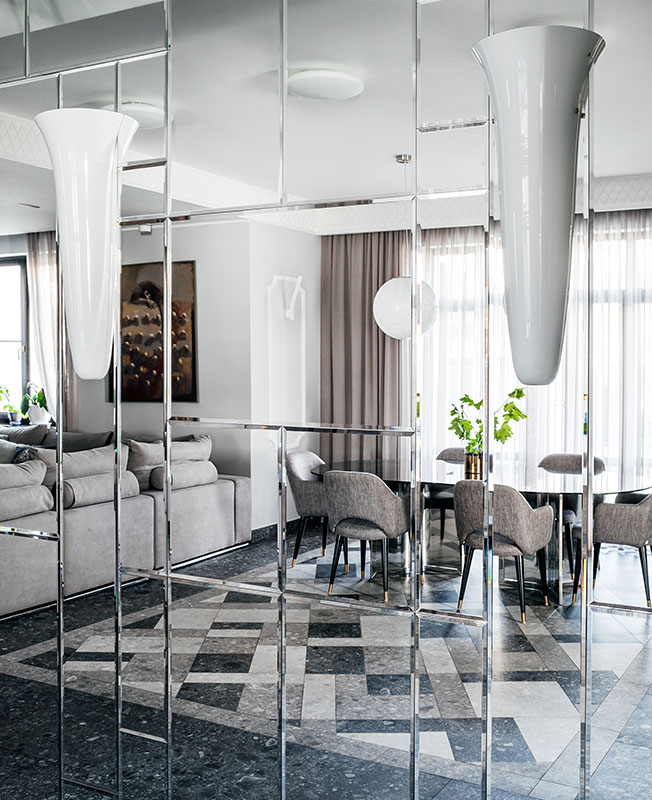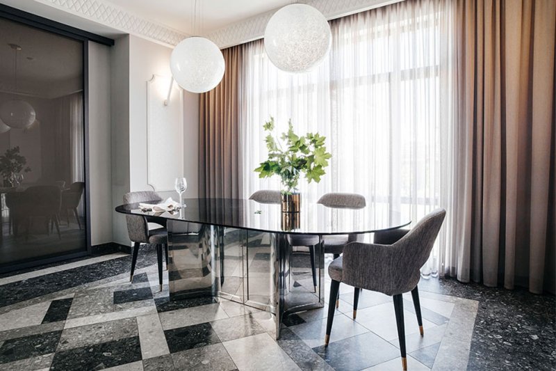 Главным героем первого этажа стал обеденный стол Gallotti&Radice с зеркальной ножкой из хромированного металла, который отражает и преломляет напольный орнамент. Панно из керамогранита было разработано и выполнено на заказ. Подвесные светильники над обеденным столом олицетворяют утренние капельки росы.