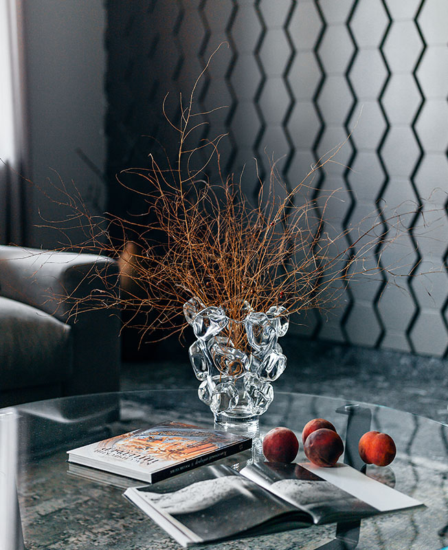«3D-панели в виде сот на стене в гостиной освещаются направленными светильниками. Когда их включаешь, можно увидеть оптическую иллюзию – соты двоятся, «плывут» и становятся еще объемнее. Абсолютно гипнотический эффект, напоминает детскую игрушку «калейдоскоп». Заказчица, когда впервые увидела, испугалась. Эффект был весьма неожиданный».