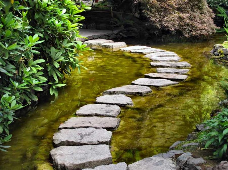 Проход через воду заменит мост или пешеходный мост. Он не доминирует над поверхностью воды, он позволяет присматриваться к растениям, и в то же время выглядит оригинально.