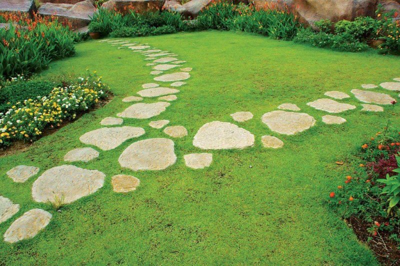 Зеленая лужайка привлекает внимание. Часто стыдно делить его на более мелкие части. В этом случае вы можете расположить каменные или деревянные элементы, которые создадут живописную дорожку и позволят вам ходить по траве сухой ногой даже после сильного дождя.