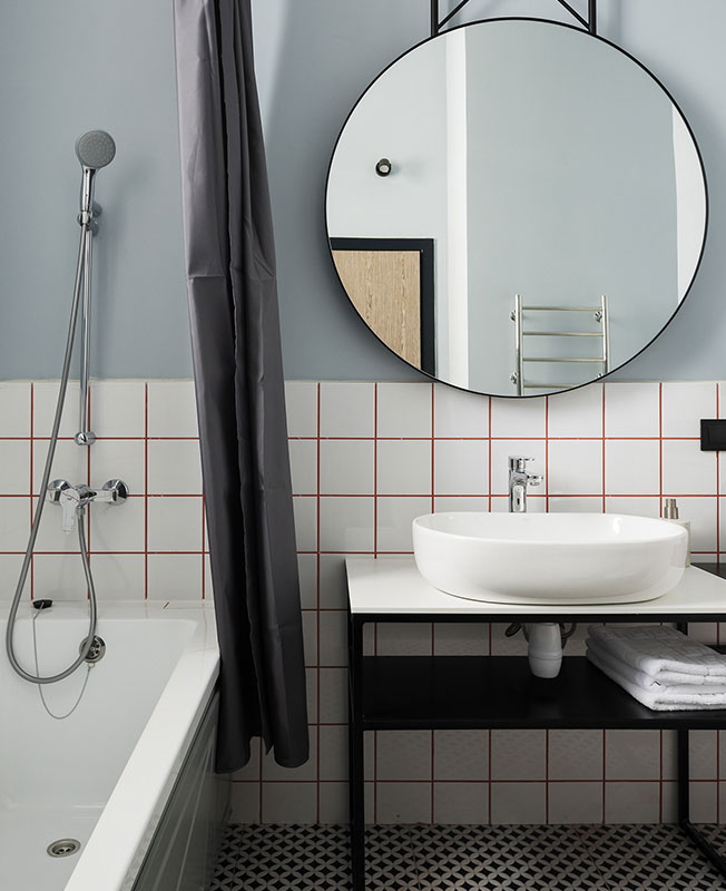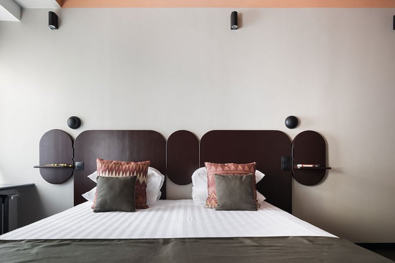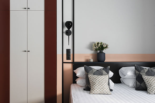 «Шкафы, прикроватные тумбы, зеркала и даже часть фурнитуры были заказаны у молодых мастеров Санкт-Петербурга. Но больше всего привлекают внимание изголовья из МДФ в темных и глубоких оттенках. Боковые элементы кроватей подвижны, круглые черные светильники — неотъемлемая часть, благодаря которой композиция приобретает минималистический характер».