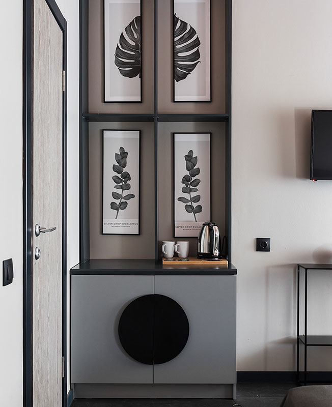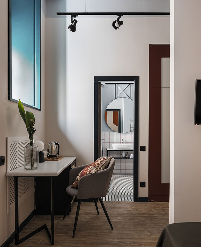 «Для отделки использовали износостойкие материалы, удобные в обслуживании, так как в отеле уборка проводится чаще. Также мы подготовили номера к приему любителей путешествовать с домашними питомцами: в некоторых комнатах вместо ковролина используется виниловая плитка».