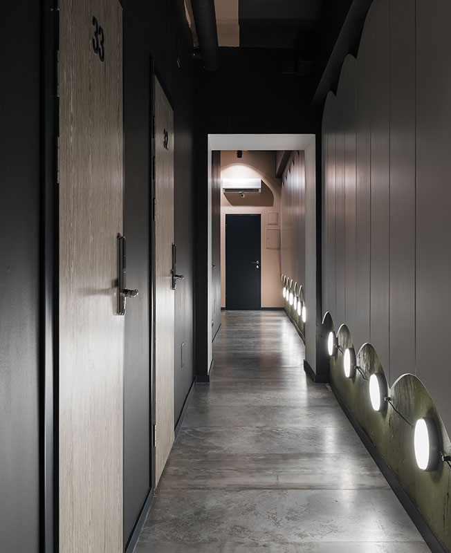 Отель площадью 200 кв. метров занимает весь первый этаж здания. Сквозного прохода нет, у каждого блока номеров свой отдельный вход. Главным достоинством помещения были высокие потолки 3,5 метра и сохранившиеся лучковые (арочные) своды.