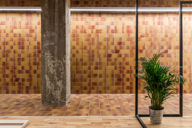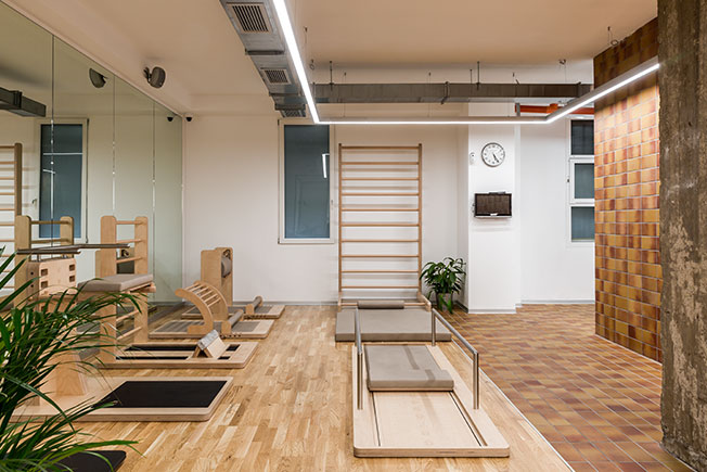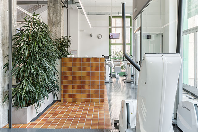 Хотелось сделать интерьер светлым и чистым, потому за основу взяли белый цвет с акцентным терракотовым, как дань уважения итальянской архитектуре. Отделочные материалы выбирали по техническим характеристикам и их сроку службы. В зоне тренажеров в качестве напольного покрытия использовали линолеум, в зале растяжки положили паркет, а в раздевалках — плитку. Большое количество зеркал визуально увеличило пространство.