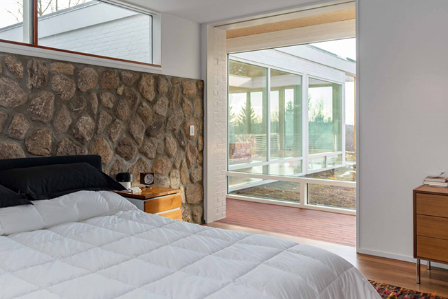 Один из самых прекрасных примеров, характеризующий руку Бройера— бетонный камин в центре гостиной открытой планировки. Древовидная скульптурная форма окружена стенами из стекла, натуральных материалов и непрерывным буколическим пейзажем.