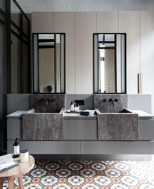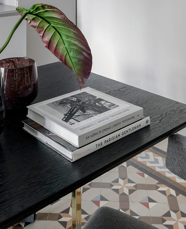 В гостиной к оригинальному валенсийскому розовому мрамору были подобраны сделанные на заказ книжные полки из дуба, диван Casadesus и винтажные кресла 1950-х годов Джиджи Радиче, переобитые бархатом Rubelli. В кухне-столовой черные смесители от Dornbracht контрастируют с обеденным столом из матового дуба от Mimouca Barcelona и стульями Tauro от Andreu World. А в ванной они хорошо смотрятся с зеркалами и парой итальянских каменных раковин.