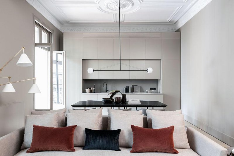 Окна выходят как на две стороны — на улицу и во внутренний двор. В квартире кухня, столовая и гостиная объединены в общее пространство. Характер всему интерьеру задает отреставрированная мозаика от легендарного производителя Nolla. Лишь в коридоре, где восстановить ее не удалось, положен паркет.