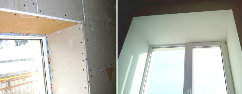 Для крепления гипсокартона к раме окна крепиться профиль, в который вставляются листы, вырезанные по параметры окна. В этом случае самое важное — точное и правильное измерение.