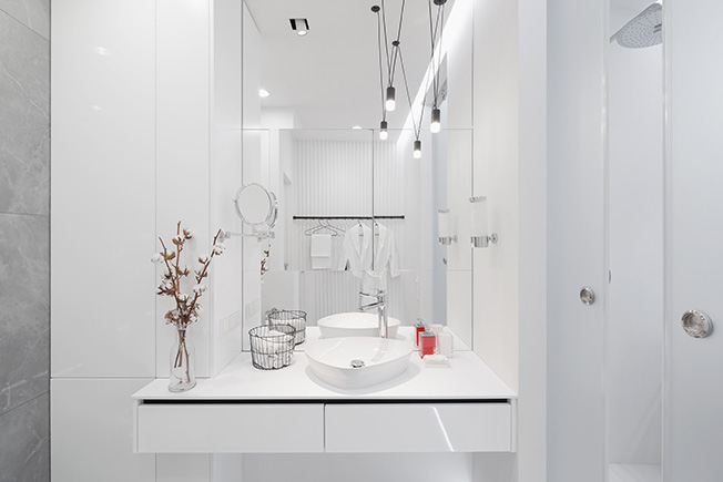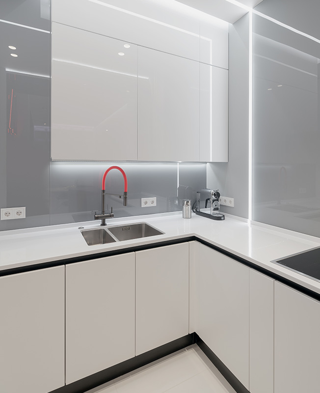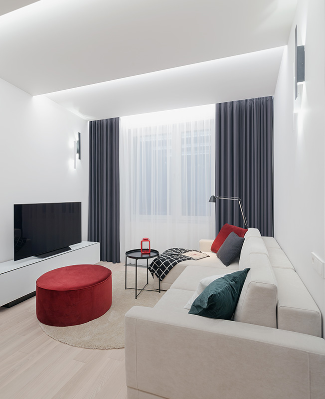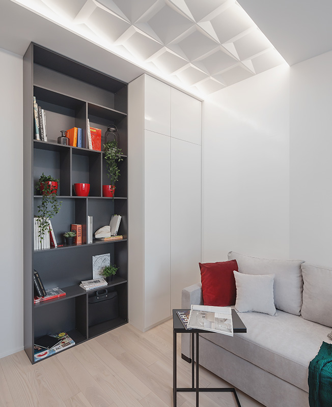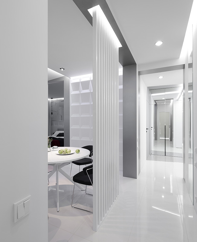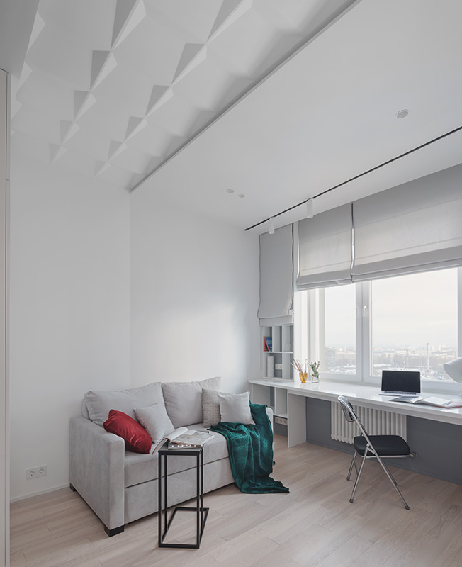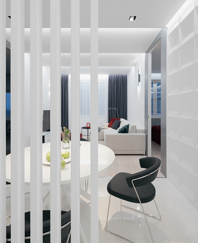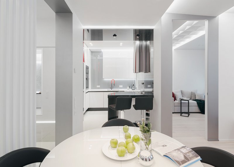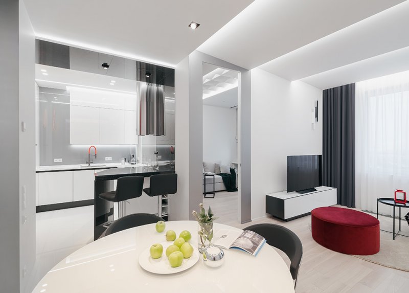 Архитекторам был необходим чистый белый цвет, который бы не желтил и не уходил в серый оттенок — его оказалось не так просто найти у производителей плитки. Поскольку основной акцент сделан на контрастной отделке и геометрии пространства, мебель использована максимально простая, функциональная: обеденный стол Pranzo, стулья Calligaris, кровать Sleepeesleep, кухня «Мария». В проекте применена сантехника Florim Сeramiche и Duravit, двери Union, светильники Centrsvet. В зоне кухни смеситель японского бренда Omoikiri гармонирует с красной буквой М.
