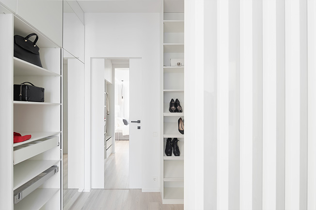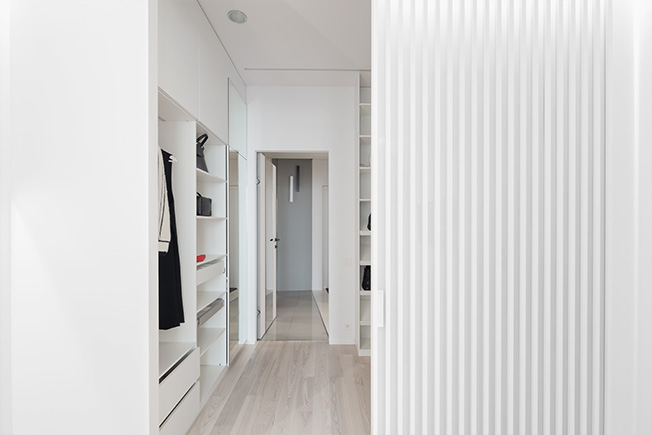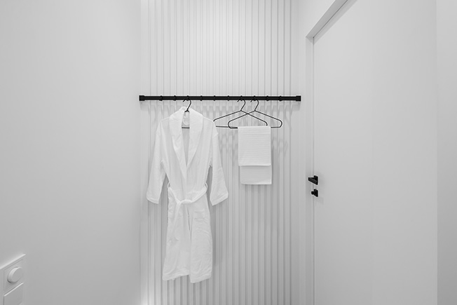 Вместо небольшого туалета и ванной комнаты сделали два полноценных санузла: один — гостевой с душевой кабиной, другой — хозяйский с приватной зоной спа. Добавили обязательную для комфортной жизни гардеробную. Вход в нее возможен как из холла, так и из спальни — это оказалось очень удобным, открыв свободу в перемещении.